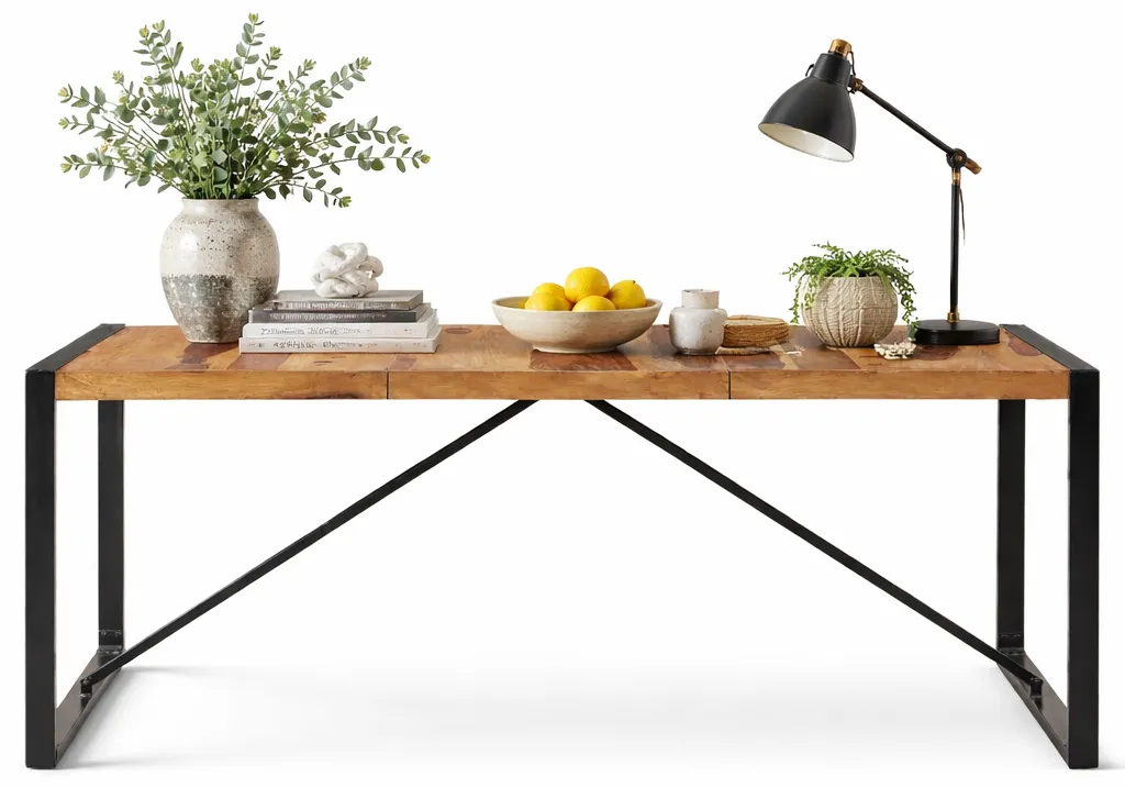 Surowiec sheesham jest wytrzymały, ale przy tym bardzo elastyczny dlatego wyróżnia się odpornością na wszelkiego rodzaju niedoskonałości, które mogą pojawić się w trakcie użytkowania stołu marki Edinos Premium. Blat mebla jest więc odporny na zarysowania, pęknięcia oraz na działanie wody. Zwróć także uwagę na jego charakterystyczny i wyrazisty rysunek słojów i kontrastujące ze sobą różnice kolorystyczne, przez co nie można pomylić stołu Fulo 6X z żadnym innym meblem. Taki wygląd sprawia, że mebel ma duże walory dekoracyjne. Dopełnieniem góry są natomiast malowane proszkowo stalowe nogi o szerokim rozstawieniu, a uwagę przyciągają pręty łączące dół blatu z podstawą mebla.