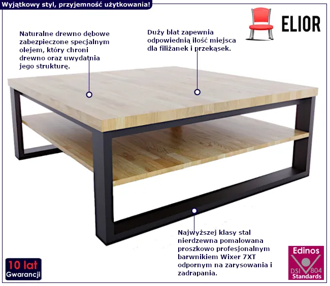 Kreatywny stół kawowy Emro marki Edinos Premium potrzebował sprawdzonych materiałów które spełnią postawione wobec nich oczekiwania. Dlatego też blat oraz półka zostały wykonane z naturalnego dębu o niezwykle wysokiej gęstości dochodzącej, aż do 930 kg/m3 oraz twardości w skali Brinella na płaszczyźnie podłużnej do 66 MPa. Blat z tego tworzywa cechuje się również wysoką odpornością na odkształcenia oraz wszelkiego rodzaju uszkodzenia mechaniczne. Przetarcia albo obicia nie stanowią problemu dla tego materiału. Nogi zostały wykonane z najwyższej jakości stali nierdzewnej pomalowanej proszkowo odpornym na zarysowania i zadrapania. Technika malowania proszkowego charakteryzuje się dużą trwałością, odpornością na korozję, chemikalia, wysoką temperaturę oraz uszkodzenia mechaniczne co gwarantuje Ci niezwykły wygląd mebla na wiele lat.