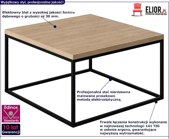 Komfortowy kwadratowy stolik loftowy Landu 3X wyróżnia się nie tylko swoją niebanalną formą i praktycznym kształtem, ale także starannym i dokładnym wykonaniem. To dlatego cieszy się on powodzeniem wśród osób preferujących niebanalne rozwiązania i szybko zyskał status bestsellera. Efektowny drewniany blat o grubości aż 30 mm wykończono najwyższej jakości fornirem dębowym. Fornir jest znakomitą alternatywą dla litego drewna, gdyż zachowuje jego fakturę i szlachetny wygląd, przy jednoczesnym wyeliminowaniu typowych wad, takich jak skrzypienie, wypaczanie czy odkształcanie. Fornir używany przy produkcji mebli marki Elior jest o 28% bardziej odporny na uszkodzenia mechaniczne i kontakt z wodą od tańszej laminowanej okleiny, dzięki temu mebel przez długi czas zachowuje pożądany wygląd i nie ulega zniszczeniu. Czarna konstrukcja stolika wykonana jest w całości z najlepszej jakości stali wysokowęglowej, dzięki czemu profil mebla posiada nawet o 46% lepszą wytrzymałość na rozciąganie oraz twardość . Stal używana do produkcji mebli Elior, została hartowana podwójnie przez proces szybkiego chłodzenia aż do temperatury końca przemiany martenzytycznej, a nie tylko do temperatury otoczenia tak jak w większości podobnych procesów. Elementy konstrukcyjne stolika zostały połączone ze sobą metodą spawania 141 tig w osłonie argonu o średnicy elektrody 0,6 mm, co jeszcze raz podkreśla ich wytrzymałość, jak również nieprzeciętne walory estetyczne.