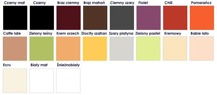 - Stoliki malujemy na wybrany kolor z palety barw firmy Dekoral: Czarny mat, czarny, Brąz ciemny, Brąz mahoń, Ciemny szary, fiolet, Chili, Pomarańcz, Caffe latte, Zielony leśny, Krem orzech, Złocisty szafran, Szary platyna, Zielony pastel, kremowy, Babie lato, Ecru, Biały mat, Śnieżnobiały. Po zakupie wpisz zamawiany przez Ciebie kolor w formularzu przy składaniu zamówienia lub prześlij nam wybraną barwę drogą mailową.