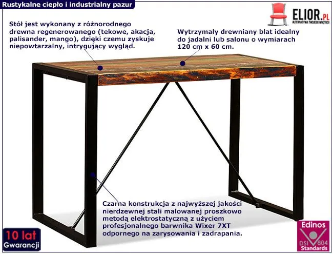 Od strony czysto technicznej blat stołu Antors 3R ma wymiary 120 cm x 60 cm, a jego wysokość 76 cm jest optymalna dla ergonomii i zwykłej wygody siedzenia przy spożywaniu posiłku, za którą będą wdzięczne Twoje plecy. Czarna konstrukcja mebla stworzona jest z najwyższej jakości nierdzewnej stali malowanej proszkowo metodą elektrostatyczną z użyciem profesjonalnego barwnika odpornego na zarysowania i zadrapania. Wykorzystana technologia malowania zapewnia również znacznie wyższy poziom gładkości, a co za tym idzie estetyki oraz odporność na korozję, chemikalia i uszkodzenia mechaniczne. Wybierając ten produkt dostajesz blat z takich wysokojakościowych gatunków drewna jak palisander, teak czy akacja, tworzących mozaikę drewnianą unikalną w każdym egzemplarzu mebla. Każdy stół Elinor  3R będzie jedyny w swoim rodzaju.