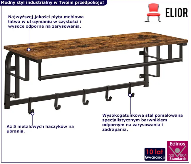• Modny kolor: rustykalny brąz, czarny. Kliknij w link i sprawdź także inne wieszaki ścienne do przedpokoju w sklepie Edinos.pl. Stwórz swój praktyczny zestaw mebli.