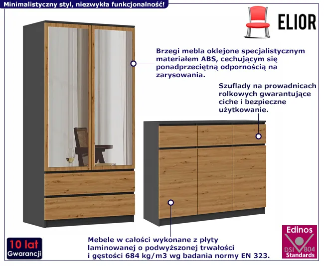 Zapewne interesuje Cię kwestia jakości, jaką prezentuje zestaw komoda i szafa Herla. Możesz być spokojna, ponieważ dołożyliśmy wszelkich starań, by zapewnić Ci długie i bezpieczne użytkowanie. Do produkcji wykorzystaliśmy wysokogatunkową, laminowaną płytę meblową zbudowaną z włókien drzewnych i związków organicznych w warunkach wysokiego ciśnienia i temperatury. Włókna ułożone są różnokierunkowo o strukturze sinusoidalnej, co zapewnia większą wytrzymałość mebla. Dodatkowo płyta została uszlachetniona cienkimi filmami melaminowymi w celu zwiększenia jej trwałości. Brzegi mebli zabezpieczyliśmy specjalistycznym tworzywem ABS, cechującym się ponadprzeciętną odpornością na uszkodzenia mechaniczne i chemiczne. Dodatkową zaletą szafy z zestawu Herla jest możliwość montażu półek z lewej lub prawej strony - tak, aby było Ci wygodnie. Duże lustra to podwójnie hartowane szkło o wytrzymałości do 120 N/mm2 na zginanie oraz około 700-900 N/mm2 na ściskanie. Dołożyliśmy wszelkich starań, aby szafa spełniła wszystkie Twoje oczekiwania. Pamiętaj, że Twoje zadowolenie to nasz sukces!