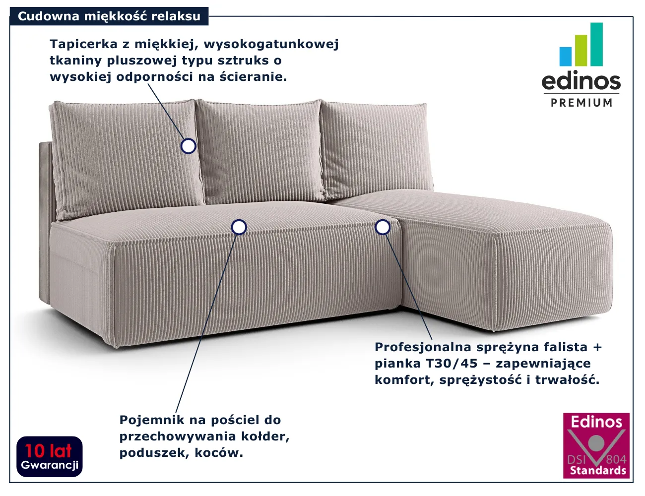 • Produkt posiada certyfikat jakości "Edinos Standards DSI 804", który potwierdza najwyższą jakość wykonania mebla oraz pełny stopień zgodności poszczególnych jednostek wytworzonego wyrobu z przyjętym wzorcem.