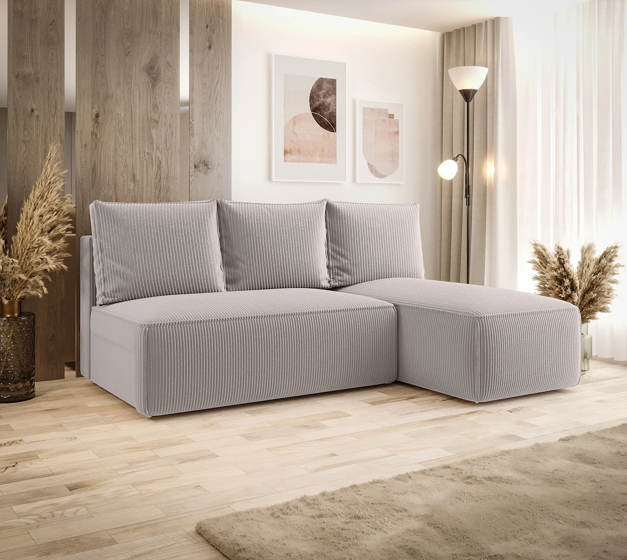 • Wolnostojąca konstrukcja – tył tapicerowany tkaniną, dzięki czemu możesz ustawić narożnik w dowolnym miejscu, nie tylko przy ścianie.