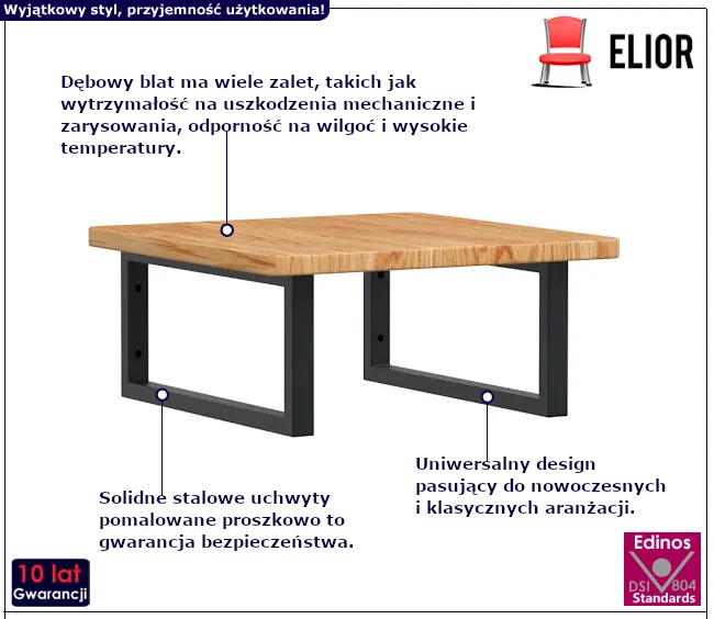 • Produkt posiada certyfikat jakości "Edinos Standards DSI 804", który potwierdza najwyższą jakość wykonania mebla oraz pełny stopień zgodności poszczególnych jednostek wytworzonego wyrobu z przyjętym wzorcem.