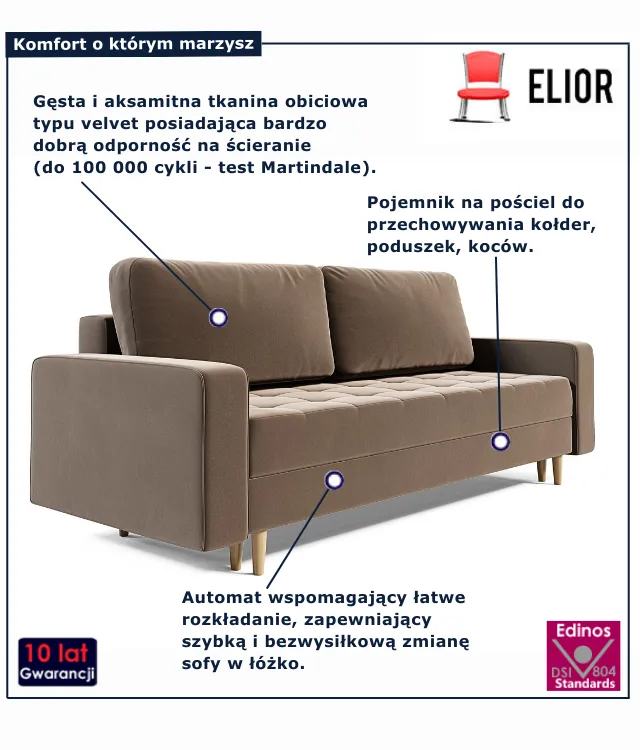 Eralis to więcej niż sofa - to funkcjonalny i elegancki element, który sprawdzi się w każdej sytuacji. Zapewni miejsce do odpoczynku, doda wnętrzu klasy i z łatwością zmieni się w wygodne łóżko zawsze wtedy, gdy tego potrzebujesz. Sofa Eralis marki Elior dostępna jest w cenie 2278 zł - wybierz ją do swojego wnętrza i ciesz się wygodą, każdego dnia.