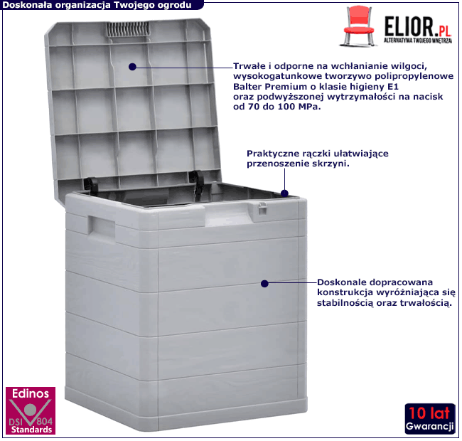 - Kolor: Jasnoszary. Kliknij w link i sprawdź także inne skrzynie ogrodowe w sklepie Edinos.pl. Stwórz swój praktyczny zestaw mebli.