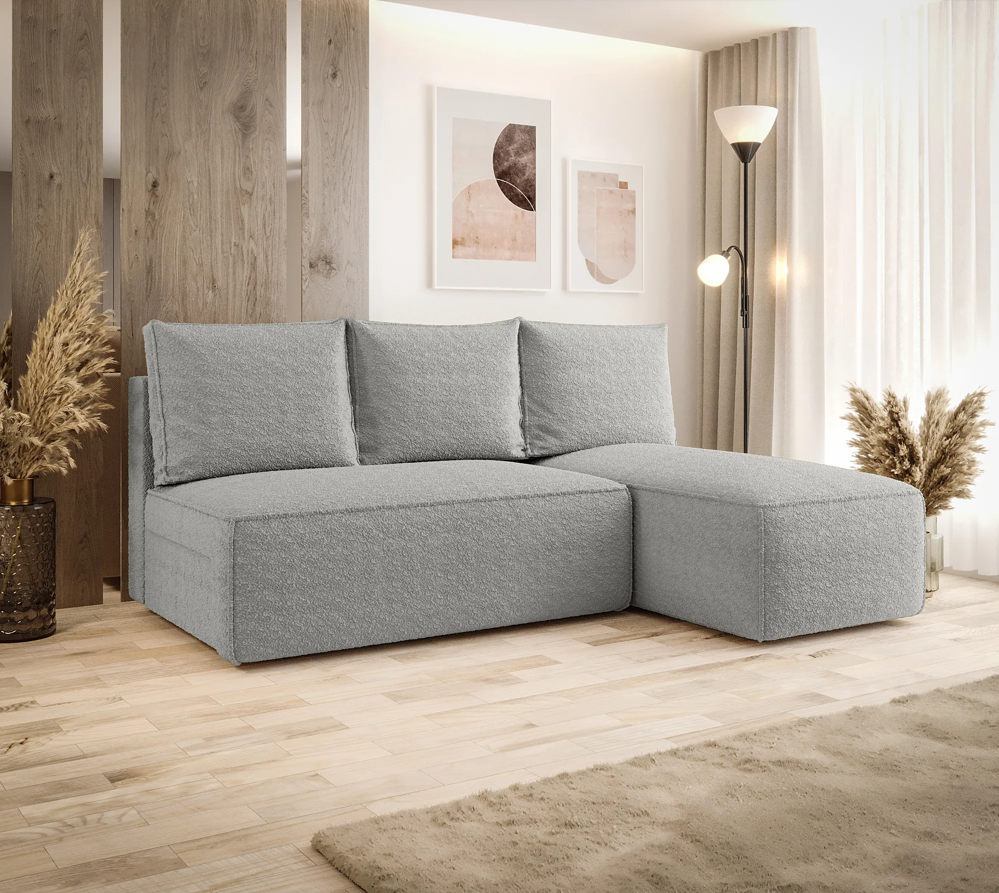 Jasnoszara sofa narożna z funkcją spania i pojemnikiem - Merello 5X