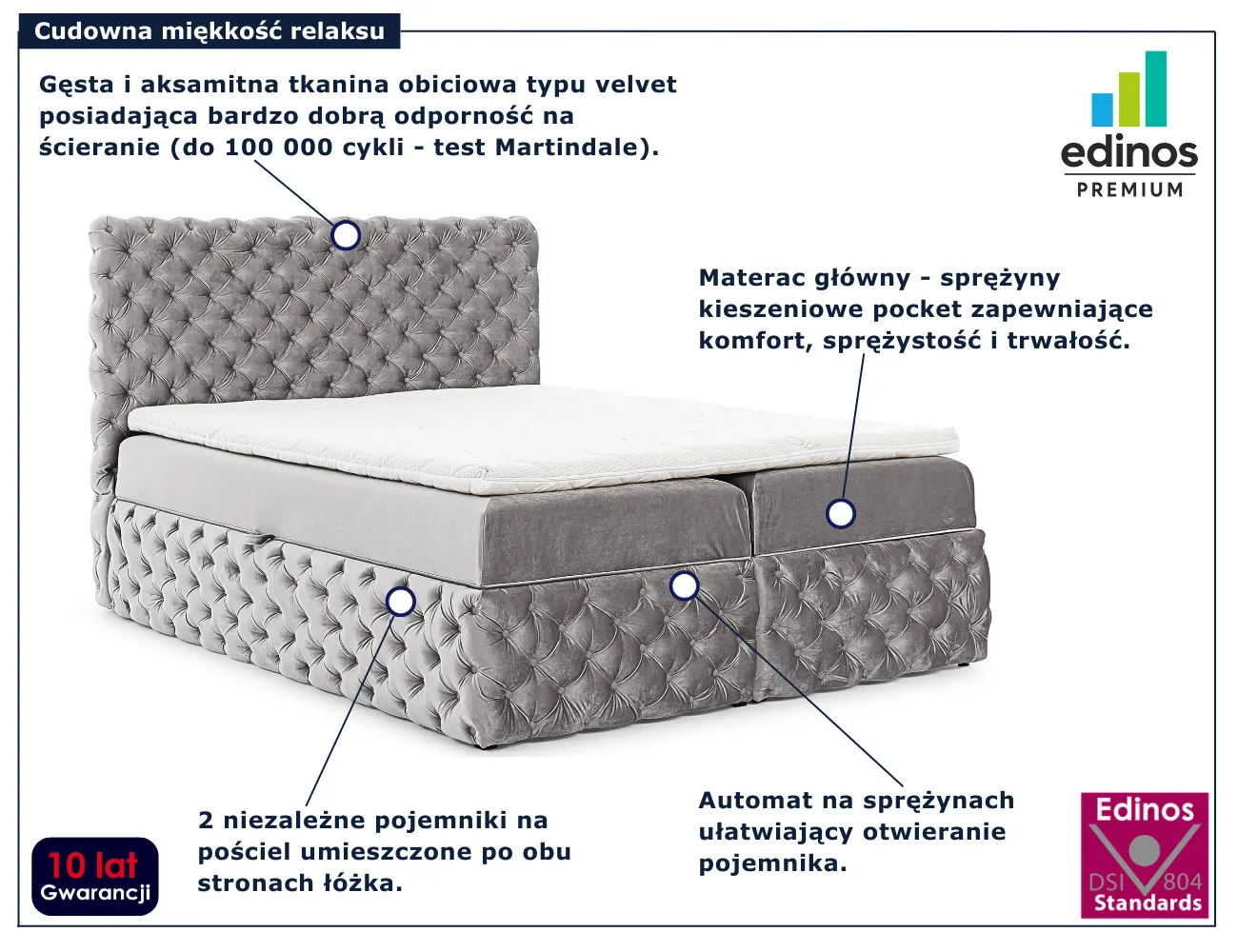 • Produkt posiada certyfikat jakości "Edinos Standards DSI 804", który potwierdza najwyższą jakość wykonania mebla oraz pełny stopień zgodności poszczególnych jednostek wytworzonego wyrobu z przyjętym wzorcem.