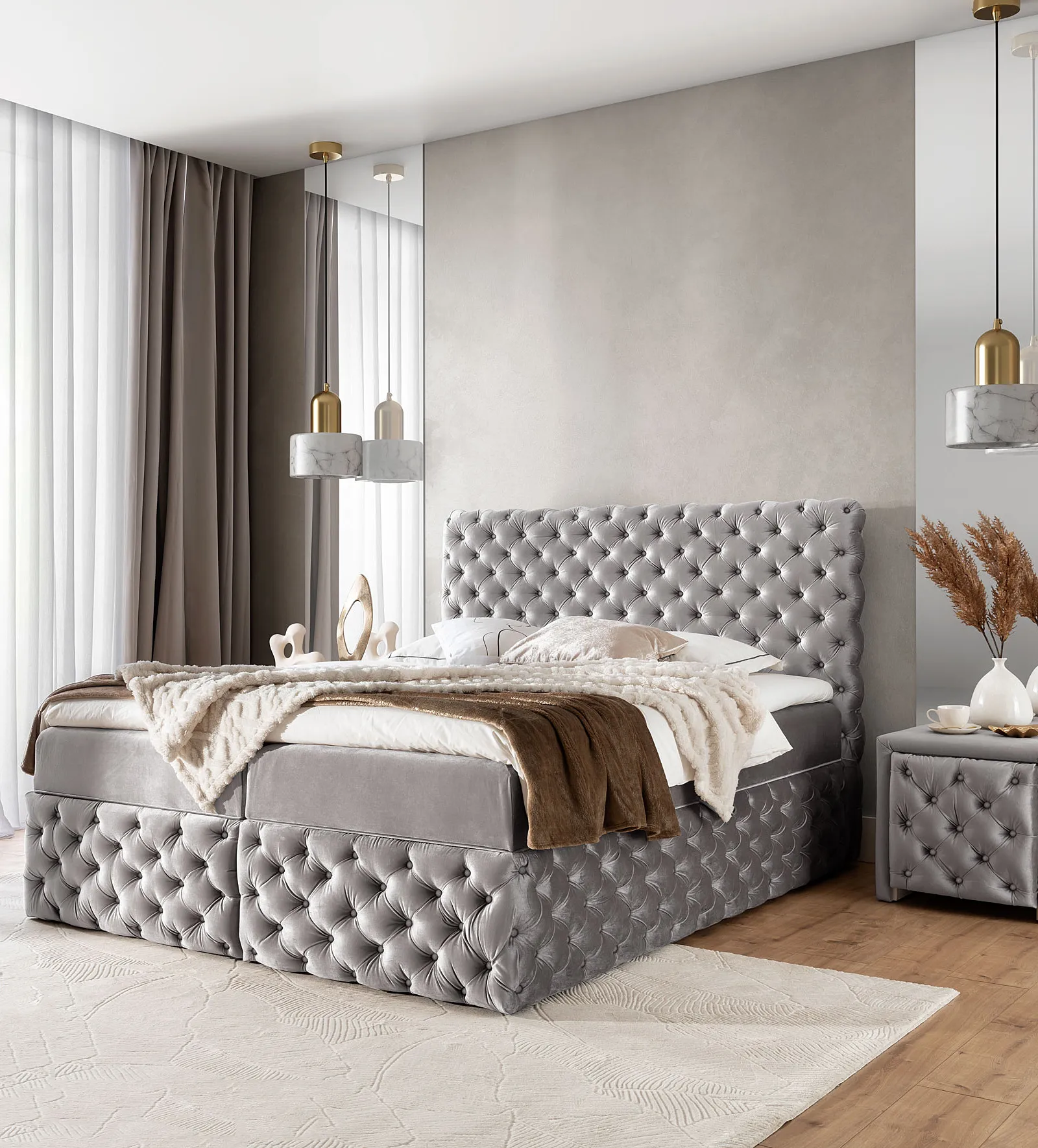 Aranżacja wnętrza z jasnoszarym łóżkiem Veltorio