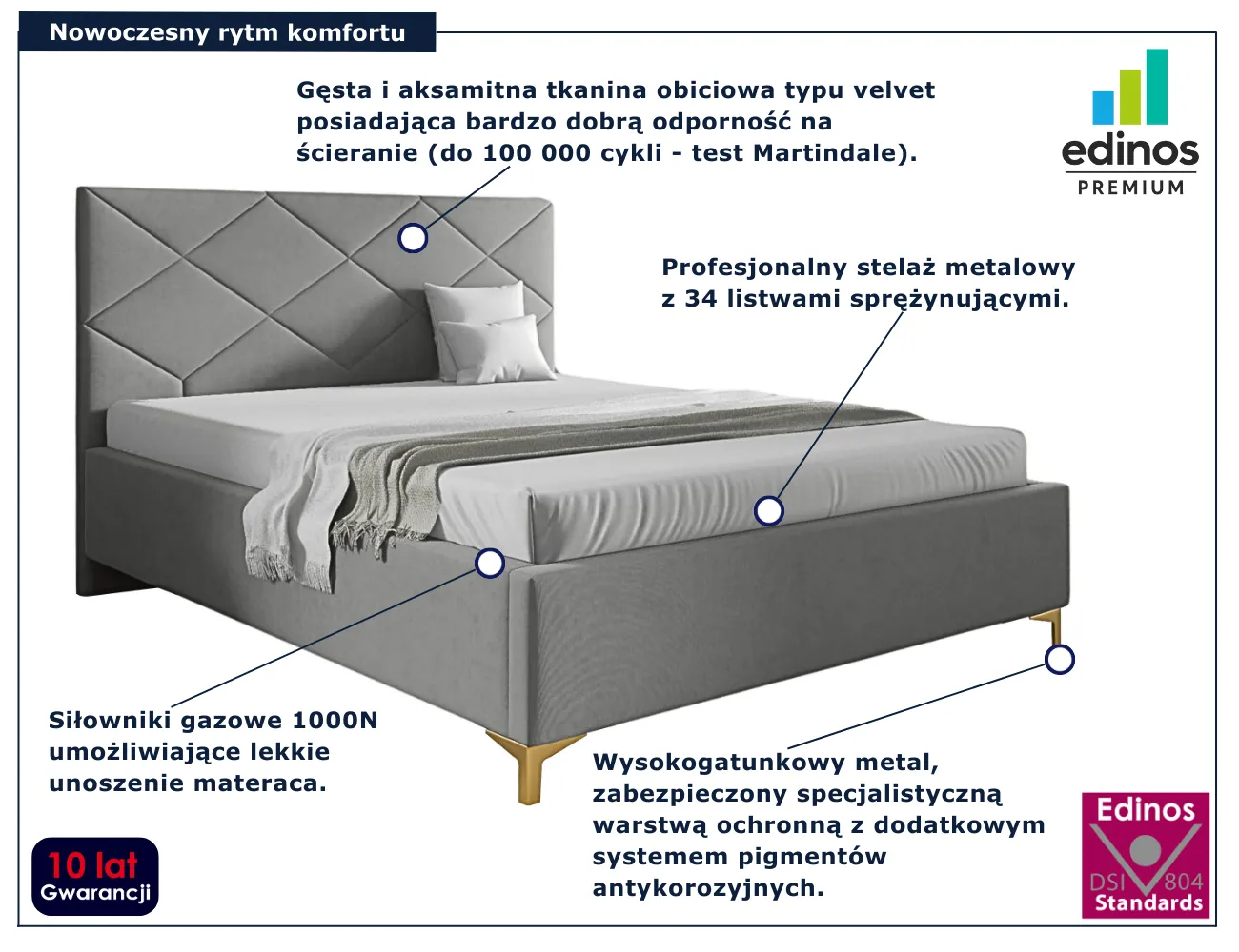 • Produkt posiada certyfikat jakości "Edinos Standards DSI 804", który potwierdza najwyższą jakość wykonania mebla oraz pełny stopień zgodności poszczególnych jednostek wytworzonego wyrobu z przyjętym wzorcem.