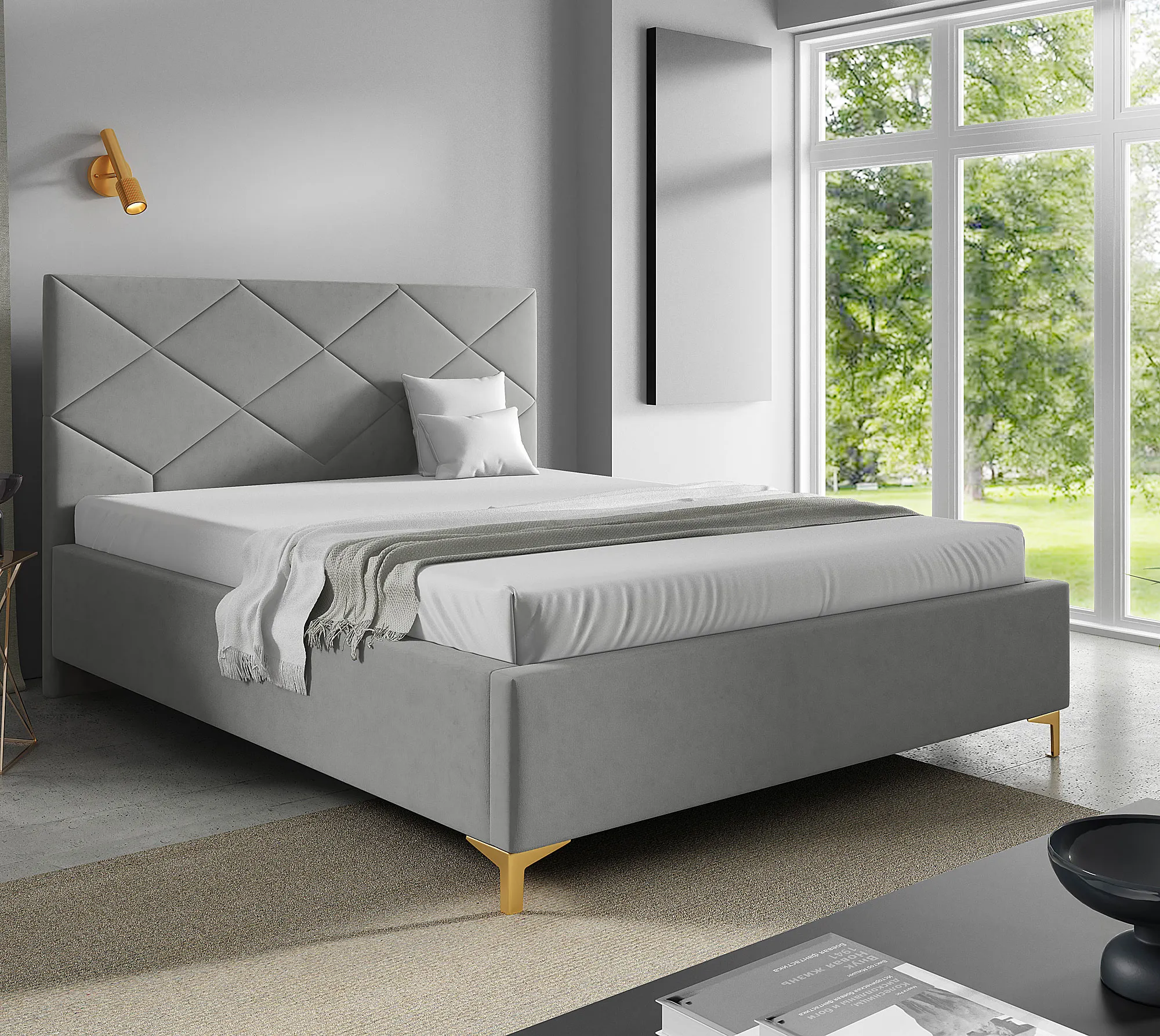 Aranżacja sypialni z jasnoszarym łóżkiem tapicerowanym Tollviano