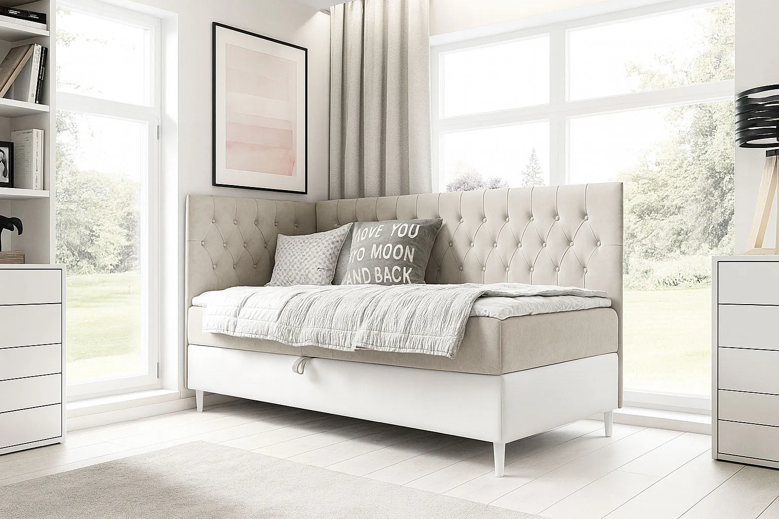 Łóżko Velmari to kwintesencja elegancji i wygody w nowoczesnym wydaniu. Jego charakterystyczny, głęboko pikowany zagłówek z narożnym oparciem tworzy przytulny kąt, w którym chce się odpocząć, poczytać książkę lub spędzić leniwy poranek z kubkiem kawy. Miękkie linie i dekoracyjne przeszycia nadają całości klasyczny urok, a zarazem subtelną lekkość. Model Velmari to nie tylko styl – to także funkcjonalność na co dzień. Pod powierzchnią spania ukryty został pojemny schowek na pościel, który bez trudu otworzysz dzięki automatowi na sprężynach. To rozwiązanie, które pozwala utrzymać porządek i maksymalnie wykorzystać przestrzeń w sypialni.