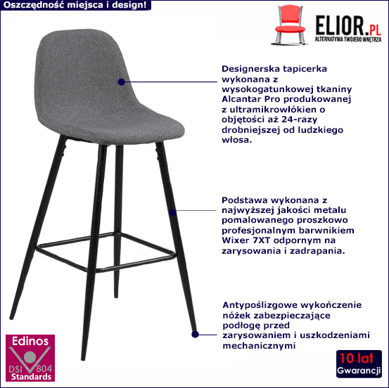 Wysokie krzesło barowe cechuje dbałość o każdy szczegół. Lekka konstrukcja pozwala Ci przesuwać i przenosić mebel, w zależności od potrzeb. Tapicerka siedziska wykonana jest z trwałej tkaniny Alcantar Pro, która ułatwi Ci utrzymanie czystości. Można ją czyścić na mokro, co jest niezwykle istotne w przypadku mebli wykorzystywanych podczas posiłków. Charakteryzuje się dużą odpornością na ścieranie, dzięki czemu hoker Ingram 2X posłuży Ci przez wiele lat. Stabilna podstawa mebla stworzona jest z najwyższej jakości nierdzewnej stali malowanej odpornym na zarysowania i zadrapania. Najwyższa jakość techniki metody natrysku proszkowego pozwoliła zaoferować firmie Elior aż 10 lat gwarancji na swoje produkty.