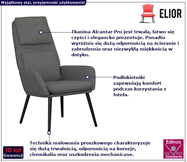 • Tkanina Alcantar Pro jest trwała, łatwo się czyści i elegancko prezentuje. Ponadto wyróżnia się dużą odpornością na ścieranie i zabrudzenia oraz niezwykłą miękkością w dotyku. Tkanina Alcantar Pro Edinos Premium produkowana jest z dokładnie wyselekcjonowanych ultramikrowłókien o objętości aż do 24-razy drobniejszej od ludzkiego włosa. Charakteryzuje się wyjątkową żywotnością, odpornością oraz niezwykłą łatwością w utrzymaniu. Posiada ponadprzeciętne cechy wytrzymałościowe, dzięki czemu unikniesz co sezonowej wymiany tapicerki.