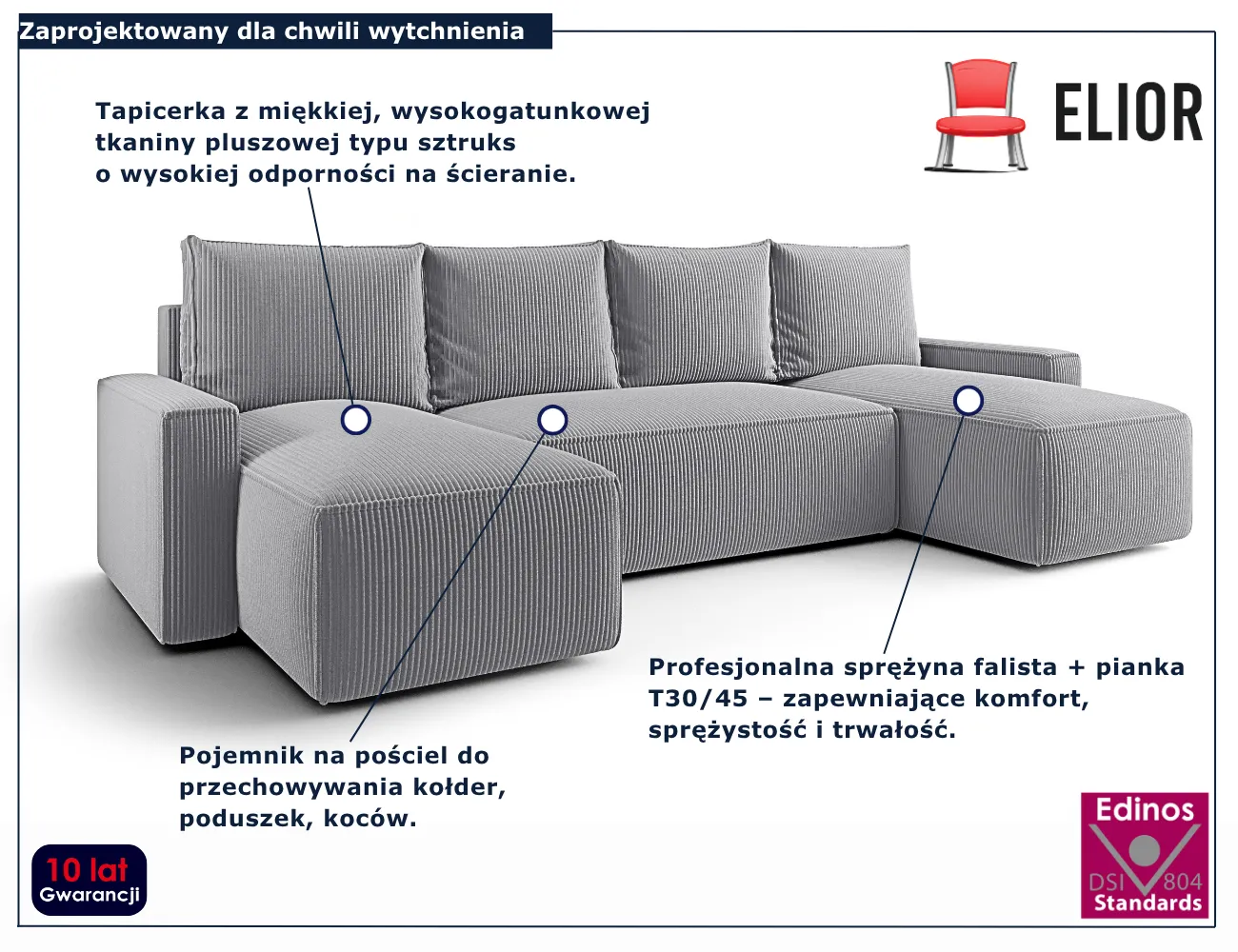 • Produkt posiada certyfikat jakości "Edinos Standards DSI 804", który potwierdza najwyższą jakość wykonania mebla oraz pełny stopień zgodności poszczególnych jednostek wytworzonego wyrobu z przyjętym wzorcem.