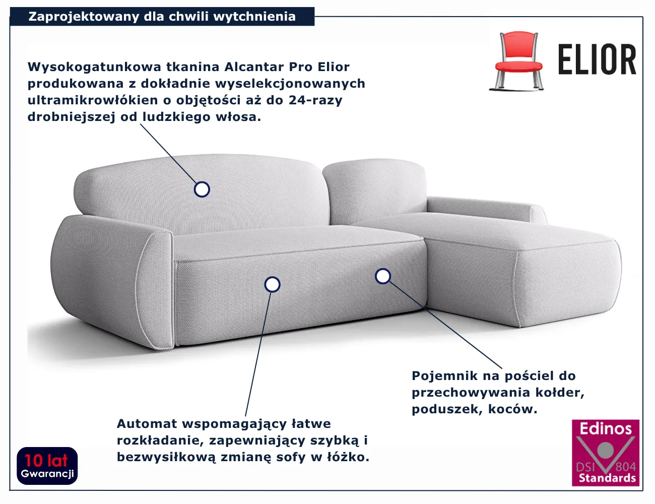 Narożnik Selvori marki Edinos Premium to nie tylko funkcjonalny mebel – to centrum domowego komfortu. W ciągu dnia stanie się idealnym miejscem do spotkań i rozmów, a wieczorem zamieni się w przytulne łóżko. Jego subtelny, ponadczasowy design sprawia, że wpasuje się w każde wnętrze, dodając mu spokoju i klasy. Postaw na narożnik Selvori w doskonałej cenie 2258 zł i przekonaj się jak duże znaczenie ma komfort.