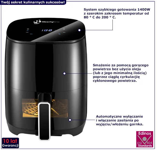 Super sprzęt do przygotowywania zdrowych posiłków. Praktycznie brak konieczności używania oleju, co jest świetne dla mojej diety. Automatyczne wyłączanie to fajna opcja, chociaż czasem włącza się zbyt wcześnie. W każdym razie, ogólnie jestem bardzo zadowolony z zakupu.