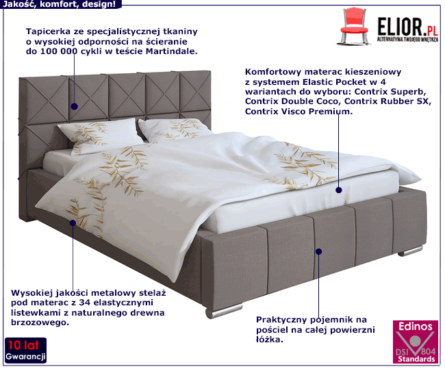 Tapicerowane łóżko Lehdes 3X to najnowsze dzieło marki Elior, stworzone z myślą o potrzebach osób wymagających najwyższej jakości, absolutnego komfortu i finezyjnego stylu. Podstawę łóżka Lehdes 3X stanowi solidna skrzynia o grubości 1,6 mm, wykonana z drewna naturalnego i płyty meblowej zbudowanej z włókien drzewnych i związków organicznych oraz uszlachetnionej cienkimi filmami melaminowymi w celu zwiększenia jej trwałości. Na skrzyni obłożonej profesjonalną pianką o grubości T25 i tapicerowanej szlachetną tkaniną lub ekoskórą opiera się doskonały jakościowo metalowy stelaż z 34 sprężynujących listewek z naturalnego drewna brzozowego. Tak zaprojektowany stelaż ułatwia cyrkulację powietrza pod materacem, dzięki czemu doskonale wpływa na jakość snu oraz wydłuża żywotność materaca. Dla większego komfortu łóżko Lanetti 2X zostało wyposażone w praktyczny schowek na pościel, niezwykle łatwo otwierany za pomocą nowoczesnych podnośników gazowych. Lehdes 3X to przykład doskonale zaprojektowanego łóżka o najwyższym stopniu komfortu, jakości i funkcjonalności w wyjątkowo eleganckim wydaniu.