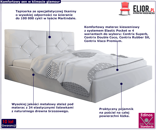 Pojedyncze tapicerowane łóżko Erdi 3X to unikatowy projekt młodych, zdolnych designerów marki Elior. Łóżko Erdi 3X zostało stworzone z potrzeby połączenia totalnej wygody i komfortu z niebanalnym wzornictwem spod znaku glamour. Podstawę łóżka Erdi 3X stanowi mocna skrzynia o grubości 1,6 mm, wykonana z drewna naturalnego i płyty meblowej zbudowanej z włókien drzewnych i związków organicznych. Dodatkowo, płyta została uszlachetniona cienkimi filmami melaminowymi w celu zwiększenia jej trwałości. Na skrzyni obłożonej profesjonalną pianką o grubości T25 i tapicerowanej szlachetną tkaniną welwetową lub ekoskórą opiera się doskonały jakościowo metalowy stelaż o maksymalnym obciążeniu aż do 200 kg, otwierany za pomocą nowoczesnych podnośników gazowych. Stelaż wykonany z 34 sprężynujących listewek z naturalnego drewna brzozowego ułatwia cyrkulację powietrza pod materacem, co pozytywnie wpływa na jakość snu oraz wydłuża żywotność materaca. W ramie łóżka mieści się pojemnik na pościel, wykonany z mocnej tkaniny technicznej, mocowany za pomocą rzepów. To praktyczne rozwiązanie doskonale uzupełnia walory użytkowe stanowiąc rewelacyjny sposób na zachowanie porządku w sypialni. Tak zaprojektowane łóżko Erdi 3X marki Elior to synonim najwyższej jakości, wyrafinowanego stylu i komfortowego snu w odsłonie glamour.