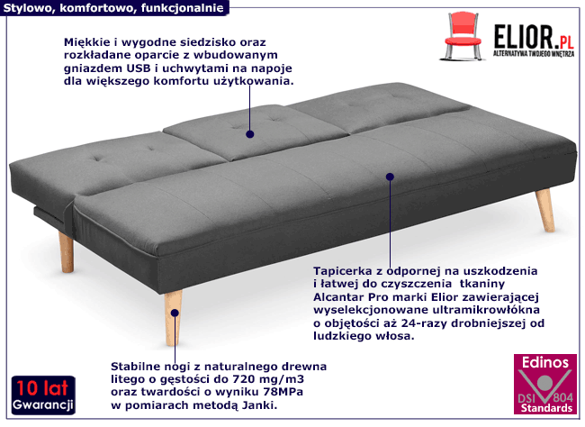 Sofa Uzzi została precyzyjnie zaprojektowana i stworzona z użyciem materiałów najwyższej jakości. Nowoczesna forma mebla z funkcją spania oraz systemem składania oparcia została tapicerowana najwyższej jakości tkaniną Alcantar Pro, charakteryzującą się dużą odpornością na ścieranie i zabrudzenie oraz niezwykłą miękkością w dotyku (dzięki warstwie poliuretanu). Tkanina Alcantar Pro, która jako jedyna na rynku produkowana jest z dokładnie wyselekcjonowanych ultramikrowłókien o objętości aż do 24-razy drobniejszej od ludzkiego włosa, charakteryzuje się wyjątkową żywotnością, odpornością oraz niezwykłą łatwością w utrzymaniu. Tkanina Alcantar jest bardzo praktyczna i można ją czyścić na mokro, co jest niezwykle istotne w przypadku mebli, przy których spożywamy posiłki lub napoje. Alcantar Pro posiada ponadprzeciętne cechy wytrzymałościowe i bardzo łatwo się czyści, dzięki czemu już nie musisz martwić się kosztowną wymianą tapicerki. Za komfort siedzenia odpowiada grube wypełnienie z pianki tapicerskiej. Dzięki zastosowaniu wiązań estrowych jest ona sprężysta i odporna na gniecenie. Sprawia to, że siedzisko oraz oparcie jest wytrzymałe i wygodne. Dla zwiększenia trwałości konstrukcja sofy oparta jest na na stabilnych nóżkach wykonanych z naturalnego drewna litego o wysokiej gęstości na poziomie do 720 mg/m3 oraz wyjątkowo dużej twardości o wyniku 78MPa w pomiarach metodą Janki. Drewno zostało zabezpieczone naturalnym impregnatem ochronnym, który chroni przed zarysowaniem oraz przetarciem. Emulsje ochronne marki Elior produkowane na bazie wody są całkowicie wolne od formaldehydu, mają neutralny zapach i nie zawierają substancji, które w trakcie użytkowania mebli mogą się ulatniać, ani innych szkodliwych związków chemicznych. Dzięki temu są dobrze tolerowane przez alergików oraz osoby wrażliwe i co najważniejsze - mają neutralny wpływ na zdrowie . Kanapa Uzzi spełni Twoje marzenie o nowoczesnym, stylowym i komfortowym meblu. Spędzaj czas tak jak lubisz - wieczór filmowy z bliską osobą, popcornem i napojami? Leniwe popołudnie z najnowszym audiobookiem? Z sofą Uzzi każdy scenariusz będzie idealny!