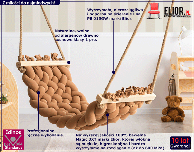 Ponieważ projektanci marki Elior sami są rodzicami, przy tworzeniu hamaku Hiroki dołożyli wszelkich starań, aby wyróżniał się on jakością na najwyższym poziomie. Bezpieczeństwo najmłodszych użytkowników stało się punktem przewodnim. Hamak w całości wykonany został ze starannie wyselekcjonowanych, wysokogatunkowych materiałów. Miękkie i niezwykle stylowe siedzisko to 100% bawełna Magic 3XT marki Elior. Materiał ten wyróżnia się ponadprzeciętną odpornością na uderzenia, naciąganie czy długotrwałe obciążenie. Do tego jest odporny na zabrudzenia oraz wilgoć. Zapewniamy Cię, że bawełna Magic 3XT marki Elior nie uczula, zapewnia skórze przewiewność, łatwo się pierze i jest bardzo miła w dotyku. Jego wypełnienie to wysokogatunkowy puch syntetyczny wytworzony z odpowiednio ukształtowanych włókien poliestrowych, których zadaniem jest utrzymanie sprężystości i stworzenie szeregu komór powietrznych dbających o termikę. Włókna poliestrowe nie chłoną nadmiernie wilgoci i w kontakcie z wodą sprawują się dużo lepiej niż naturalny puch. Puch wykorzystany do stworzenia hamaku Hiroki wyróżnia się także wysoką sprężystością - aż 700 cuin. Całość utrzymuje się na grubych, wytrzymałych i odpornych na ścieranie linach przymocowanych do naturalnego drewna sosnowego. Dokładnie szlifowana powierzchnia materiału zabezpieczona została naturalnym impregnatem ochronnym, całkowicie wolnym od formaldehydu, który chroni przed zarysowaniem oraz przetarciem drewna. Dzięki temu jest dobrze tolerowane przez alergików oraz osoby wrażliwe i co najważniejsze - mają neutralny wpływ na zdrowie Twojego dziecka w przeciwieństwie do innych produktów konkurencji.