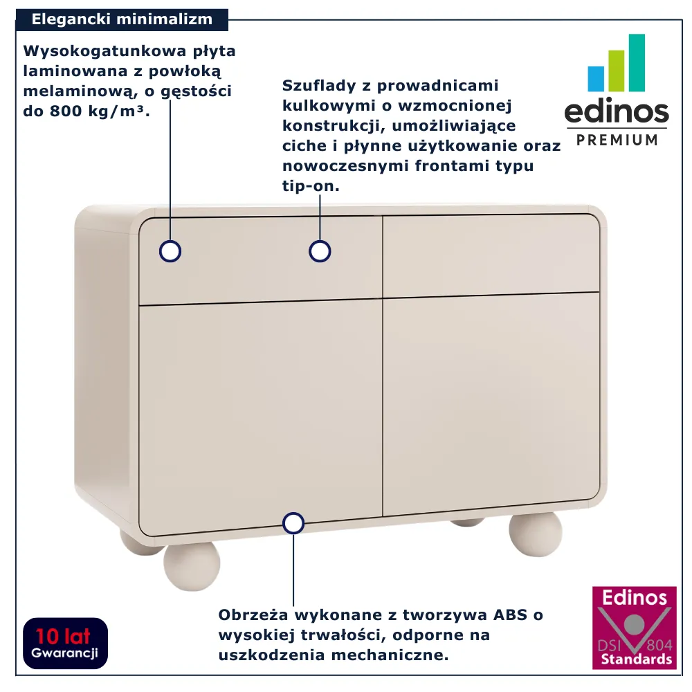• Produkt posiada certyfikat jakości "Edinos Standards DSI 804", który potwierdza najwyższą jakość wykonania mebla oraz pełny stopień zgodności poszczególnych jednostek wytworzonego wyrobu z przyjętym wzorcem.