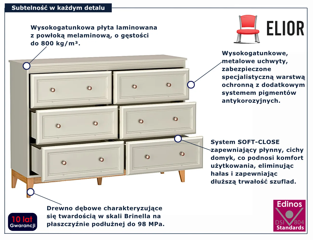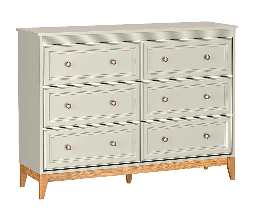 Komoda Lunvior 5X marki Edinos Premium to połączenie klasycznej elegancji z nowoczesną funkcjonalnością. Jej delikatny kaszmirowy odcień w zestawieniu z naturalnym drewnem nóg tworzy subtelną, przytulną całość, która harmonijnie wpisuje się w każde wnętrze – od klasycznego po nowoczesne. Mebel wyposażony jest w sześć pojemnych szuflad, rozmieszczonych symetrycznie po trzy z każdej strony. Dzięki temu zapewnia doskonałą organizację przestrzeni i szybki dostęp do codziennych drobiazgów. Każda szuflada porusza się lekko i cicho, co gwarantuje maksymalny komfort użytkowania.
