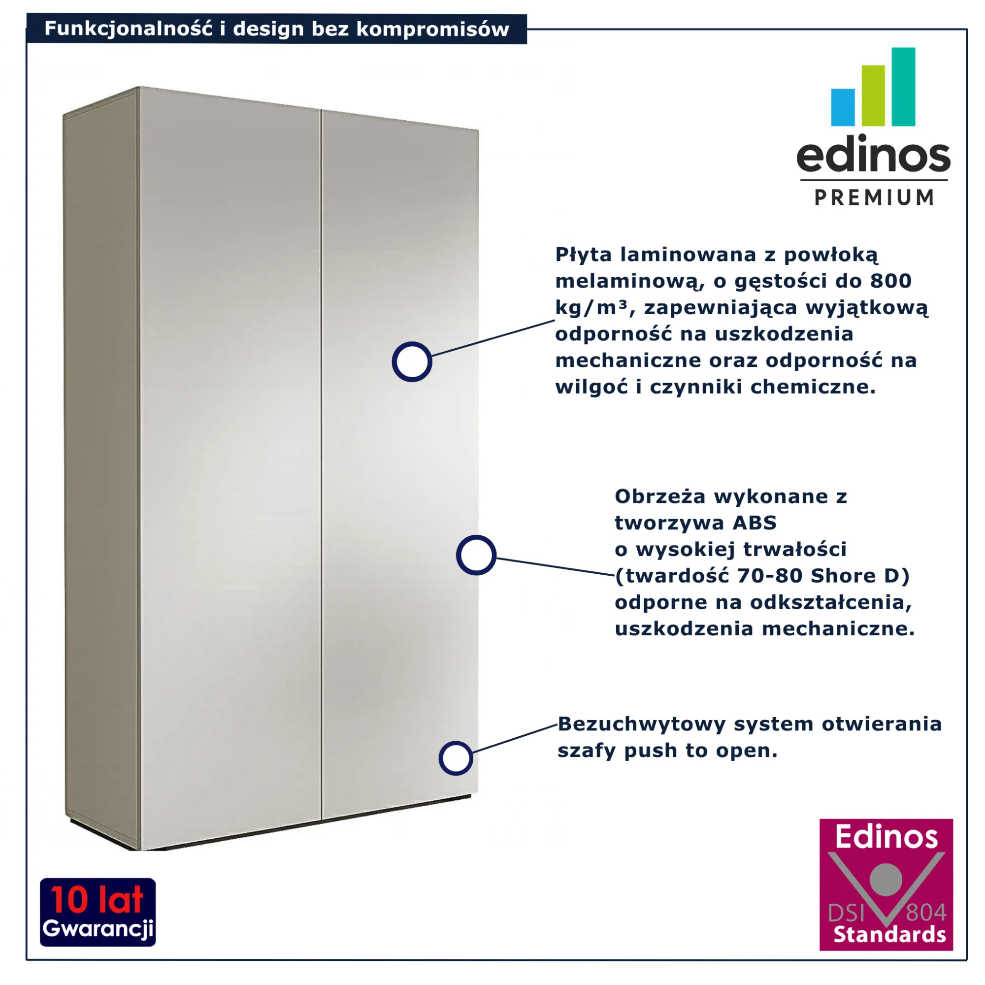 • Produkt posiada certyfikat jakości "Edinos Standards DSI 804", który potwierdza najwyższą jakość wykonania mebla oraz pełny stopień zgodności poszczególnych jednostek wytworzonego wyrobu z przyjętym wzorcem.