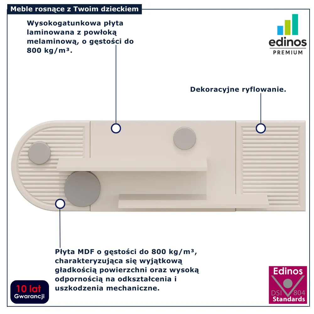 • Produkt posiada certyfikat jakości "Edinos Standards DSI 804", który potwierdza najwyższą jakość wykonania mebla oraz pełny stopień zgodności poszczególnych jednostek wytworzonego wyrobu z przyjętym wzorcem.