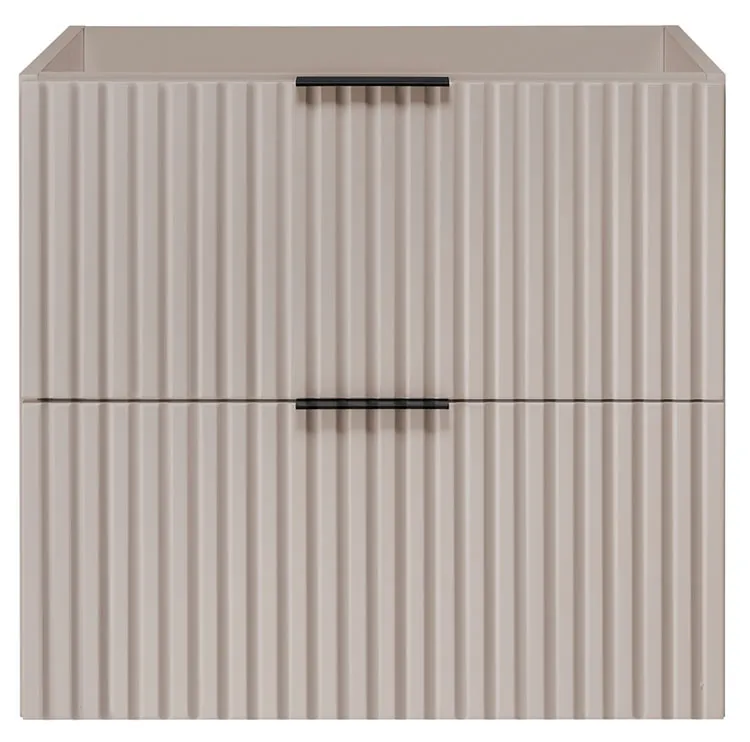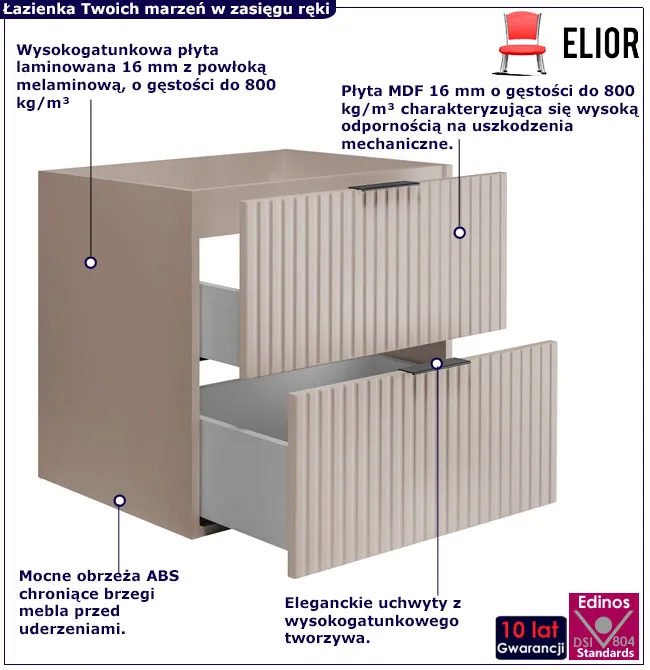 - Fronty wykonane z frezowanej płyty MDF 16 mm zapewniają trwałość i dekoracyjny wygląd. Ryflowana powierzchnia dodaje głębi i elegancji.