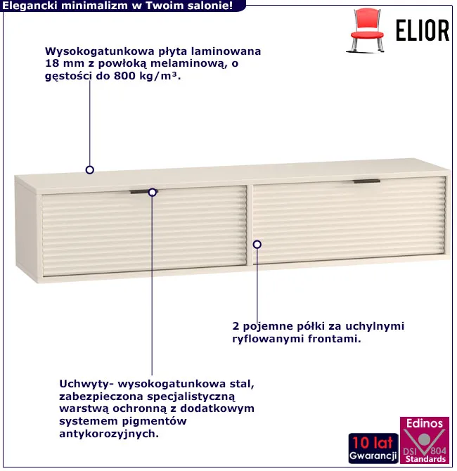 Wyrazisty detal może całkowicie odmienić charakter wnętrza – szafka RTV Inao 5X marki Edinos Premium to mebel, który łączy nowoczesny minimalizm z elegancką strukturą ryflowanych frontów. Jej wisząca konstrukcja nadaje lekkości i optycznie powiększa przestrzeń. Ryflowania na frontach dodają meblowi głębi i szlachetnego wyrazu, czyniąc z niego nie tylko praktyczny, ale i dekoracyjny element wnętrza. To doskonały wybór dla tych, którzy szukają oryginalnych rozwiązań w nowoczesnej stylistyce.