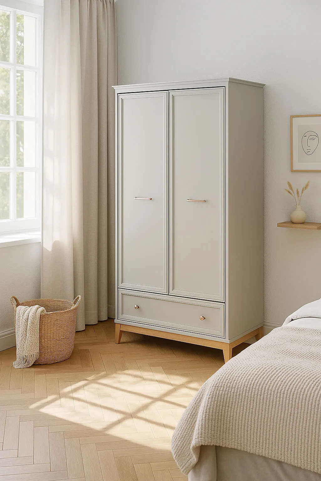 Szafa Lunvior 11X to idealne połączenie estetyki, praktyczności i solidnego wykonania. Jej klasyczna forma w delikatnym kaszmirowym odcieniu została uzupełniona o ciepłe, drewniane nóżki i subtelne uchwyty w kolorze różowego złota. Całość prezentuje się lekko, elegancko i ponadczasowo – tak, aby dopasować się zarówno do sypialni, garderoby, jak i przedpokoju. Wnętrze szafy zaprojektowano z myślą o maksymalnej wygodzie. Po lewej stronie znajduje się drążek na ubrania wiszące, idealny na płaszcze, koszule i sukienki, a obok – zestaw czterech praktycznych półek, które pozwalają na uporządkowane przechowywanie złożonych ubrań, pościeli czy akcesoriów. W dolnej części umieszczono pojemną szufladę, doskonałą na drobniejsze elementy garderoby, bieliznę lub dodatki.