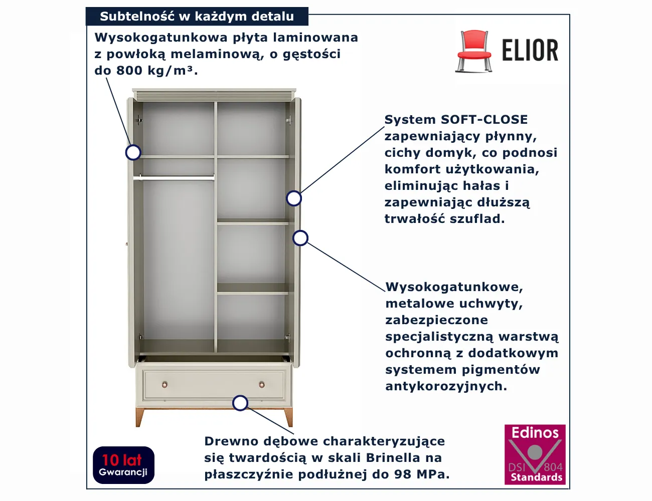 • Produkt posiada certyfikat jakości "Edinos Standards DSI 804", który potwierdza najwyższą jakość wykonania mebla oraz pełny stopień zgodności poszczególnych jednostek wytworzonego wyrobu z przyjętym wzorcem.