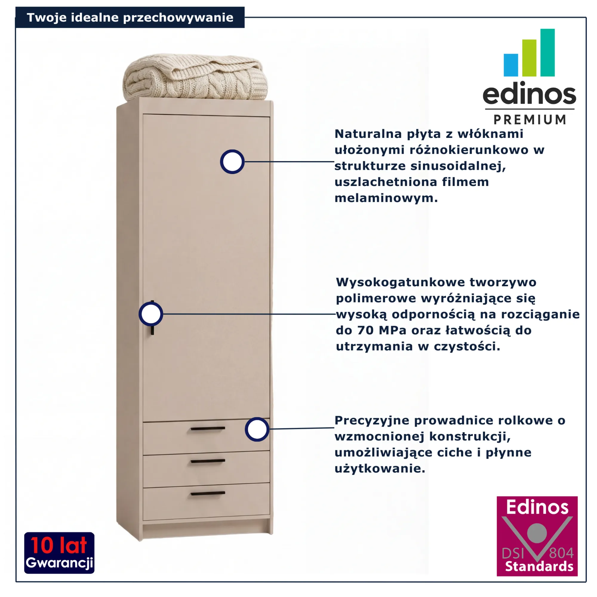• Produkt posiada certyfikat jakości "Edinos Standards DSI 804", który potwierdza najwyższą jakość wykonania mebla oraz pełny stopień zgodności poszczególnych jednostek wytworzonego wyrobu z przyjętym wzorcem.