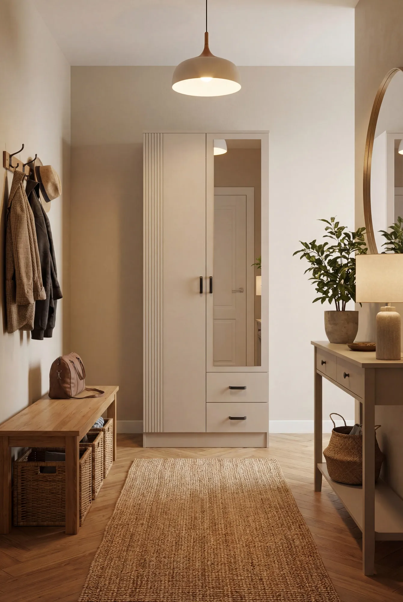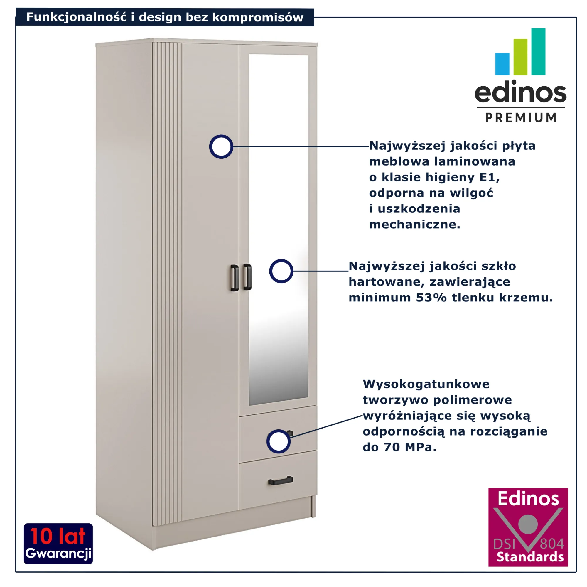 Szafa Rivanox marki Edinos Premium to propozycja dla osób, które chcą połączyć porządek, nowoczesny detal i codzienną wygodę w jednym meblu. Jej smukła, dopracowana bryła świetnie sprawdzi się zarówno w sypialni, jak i w przedpokoju, nie przytłaczając wnętrza, a jednocześnie oferując wszystko, czego potrzeba do przechowywania. Charakterystyczny, pionowy detal na froncie nadaje całości wyrazisty, nowoczesny charakter, a duże lustro sprawia, że przestrzeń staje się jaśniejsza i optycznie większa. Wnętrze szafy zostało zaplanowane z myślą o funkcjonalności – znajdziesz tu miejsce na ubrania wiszące, półki oraz dwie pojemne szuflady, które ułatwiają organizację codziennych drobiazgów. Rivanox to szafa, która porządkuje przestrzeń i podkreśla charakter wnętrza.