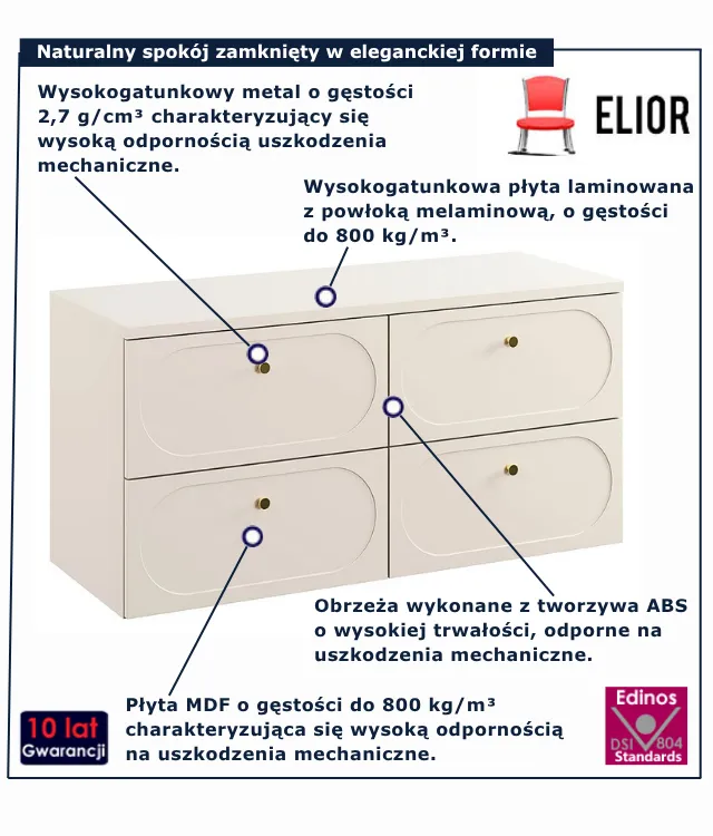 • Produkt posiada certyfikat jakości "Edinos Standards DSI 804", który potwierdza najwyższą jakość wykonania mebla oraz pełny stopień zgodności poszczególnych jednostek wytworzonego wyrobu z przyjętym wzorcem.
