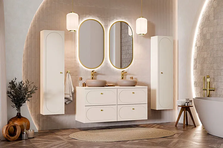 W łazience, w której króluje kolekcja Avenari marki Elior, panuje spokój, ład i niewymuszona elegancja. Jej znakiem rozpoznawczym są delikatne, obłe frezowania frontów, subtelny piaskowy odcień oraz złote, metalowe gałki, które nadają meblom biżuteryjnego charakteru. Szafki pod umywalkę – zarówno nablatową, jak i meblową – doskonale komponują się ze smukłym słupkiem wiszącym, tworząc przemyślaną, funkcjonalną całość. To kolekcja stworzona dla tych, którzy cenią spójność stylistyczną, praktyczne rozwiązania i estetykę, która nie męczy, tylko cieszy przez lata. Marzysz o łazience, która w końcu wygląda tak, jak powinna?