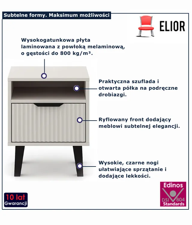 • Produkt posiada certyfikat jakości "Edinos Standards DSI 804", który potwierdza najwyższą jakość wykonania mebla oraz pełny stopień zgodności poszczególnych jednostek wytworzonego wyrobu z przyjętym wzorcem.