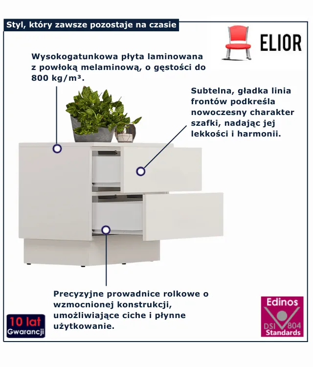 • Produkt posiada certyfikat jakości "Edinos Standards DSI 804", który potwierdza najwyższą jakość wykonania mebla oraz pełny stopień zgodności poszczególnych jednostek wytworzonego wyrobu z przyjętym wzorcem.