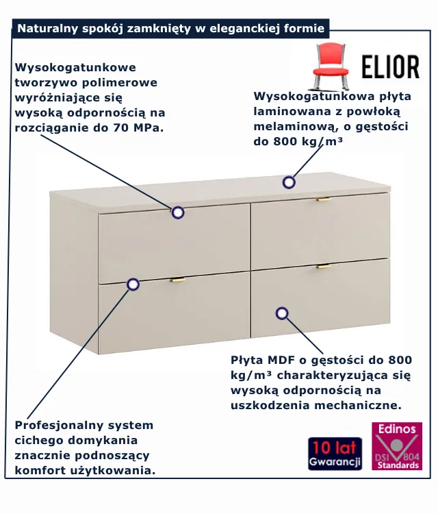 • Produkt posiada certyfikat jakości "Edinos Standards DSI 804", który potwierdza najwyższą jakość wykonania mebla oraz pełny stopień zgodności poszczególnych jednostek wytworzonego wyrobu z przyjętym wzorcem.