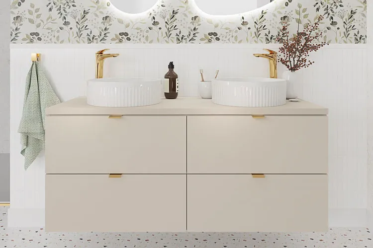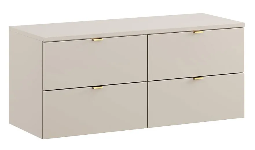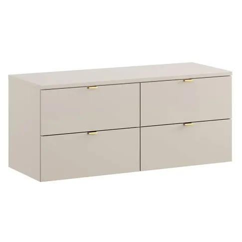 Szafka pod umywalkę Belvani 5X 120 cm to model, który świetnie odnajdzie się w większych przestrzeniach, jako element większego zestawu z dwiema umywalkami. Posiada cztery przestronne szuflady o ukrytym prowadzeniu i subtelnych, złotych uchwytach, które dodają całości eleganckiego akcentu. Jej prosta forma i jasne wykończenie optycznie powiększają przestrzeń, a bezproblemowy montaż sprawia, że dopasowanie do wnętrza jest wyjątkowo proste.