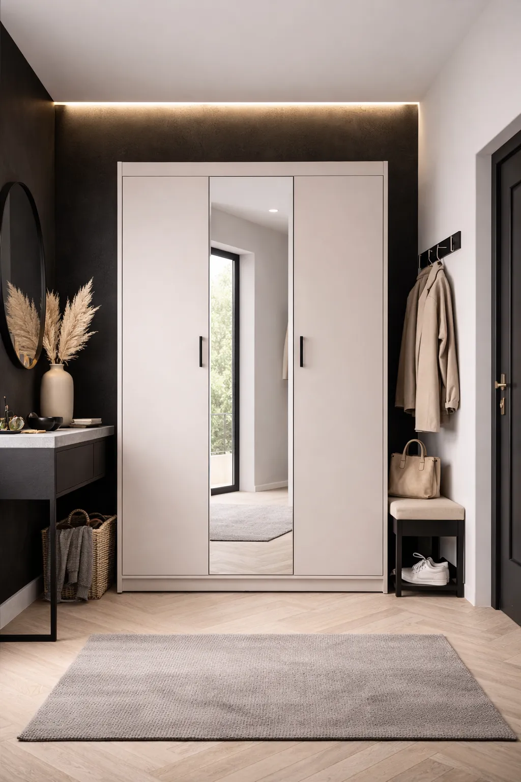 Aranżacja z kaszmirową szafą trzydrzwiową z lustrem Parioni 9X