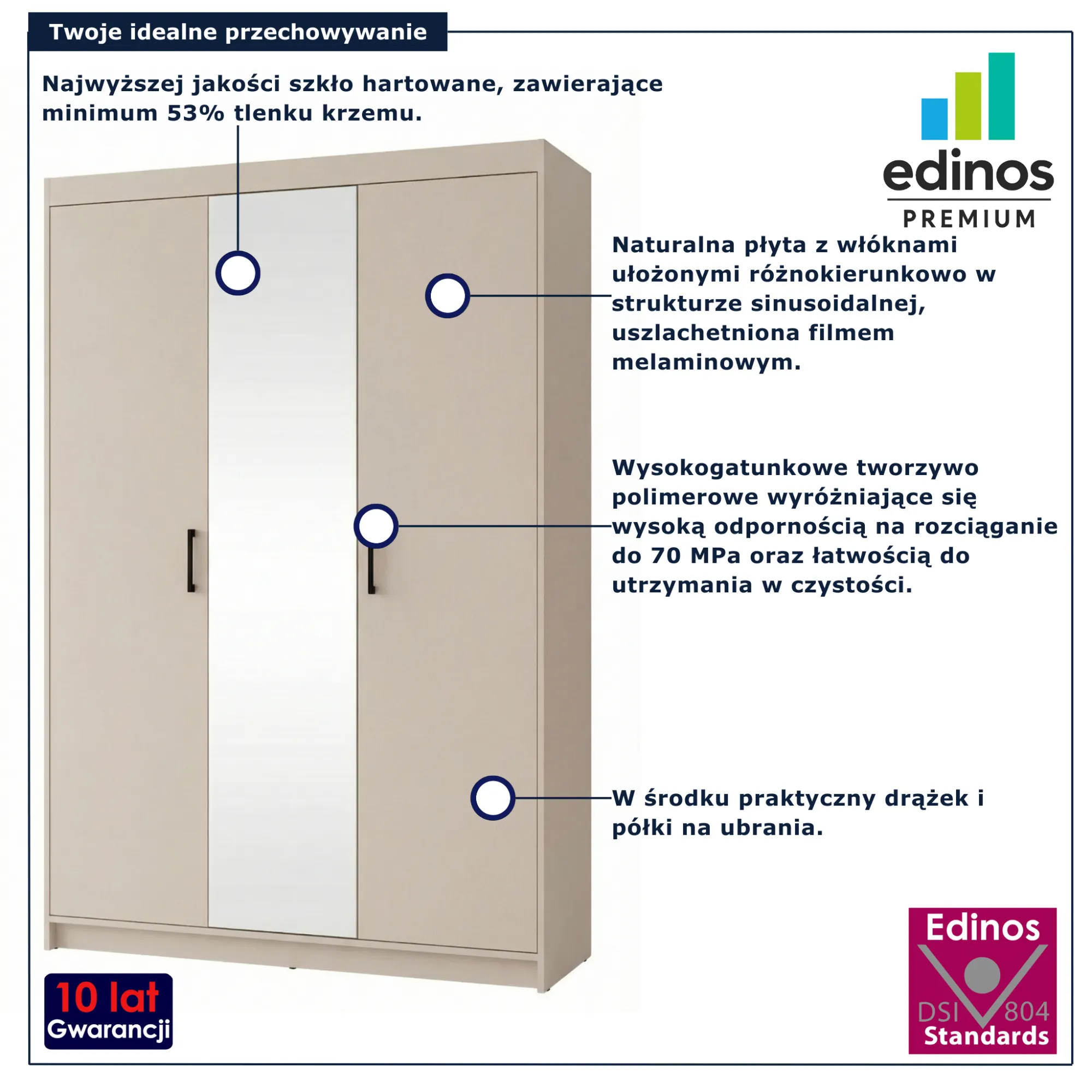 • Produkt posiada certyfikat jakości "Edinos Standards DSI 804", który potwierdza najwyższą jakość wykonania mebla oraz pełny stopień zgodności poszczególnych jednostek wytworzonego wyrobu z przyjętym wzorcem.
