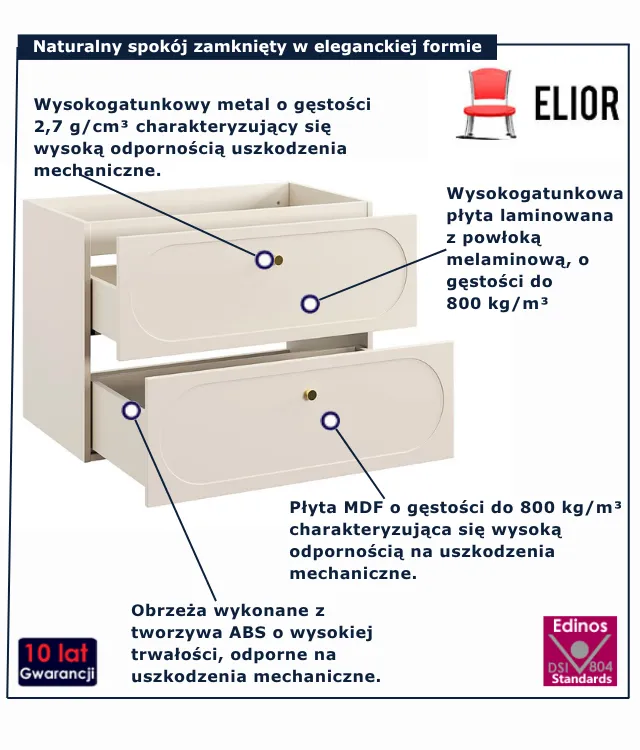 • Produkt posiada certyfikat jakości "Edinos Standards DSI 804", który potwierdza najwyższą jakość wykonania mebla oraz pełny stopień zgodności poszczególnych jednostek wytworzonego wyrobu z przyjętym wzorcem.