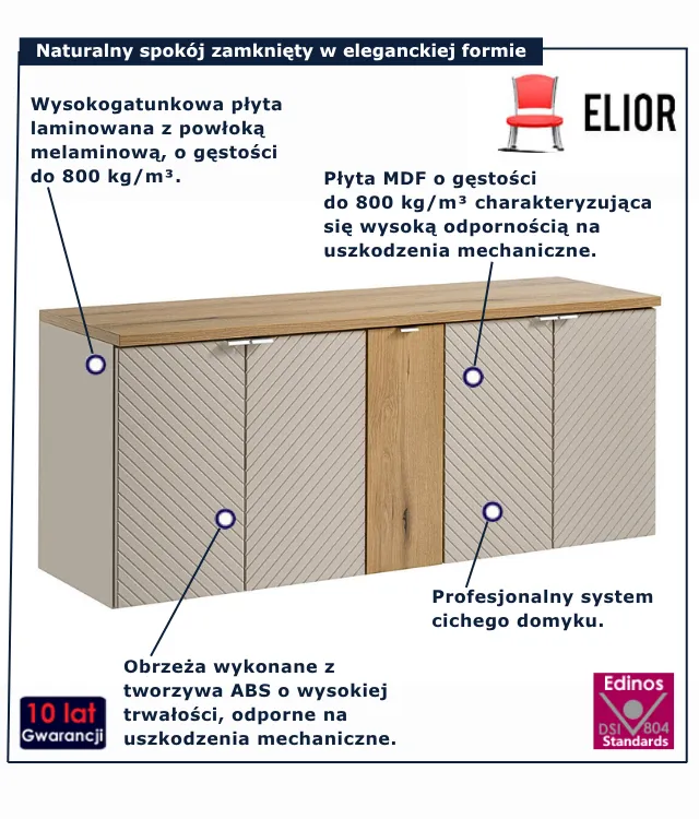 • Produkt posiada certyfikat jakości "Edinos Standards DSI 804", który potwierdza najwyższą jakość wykonania mebla oraz pełny stopień zgodności poszczególnych jednostek wytworzonego wyrobu z przyjętym wzorcem.