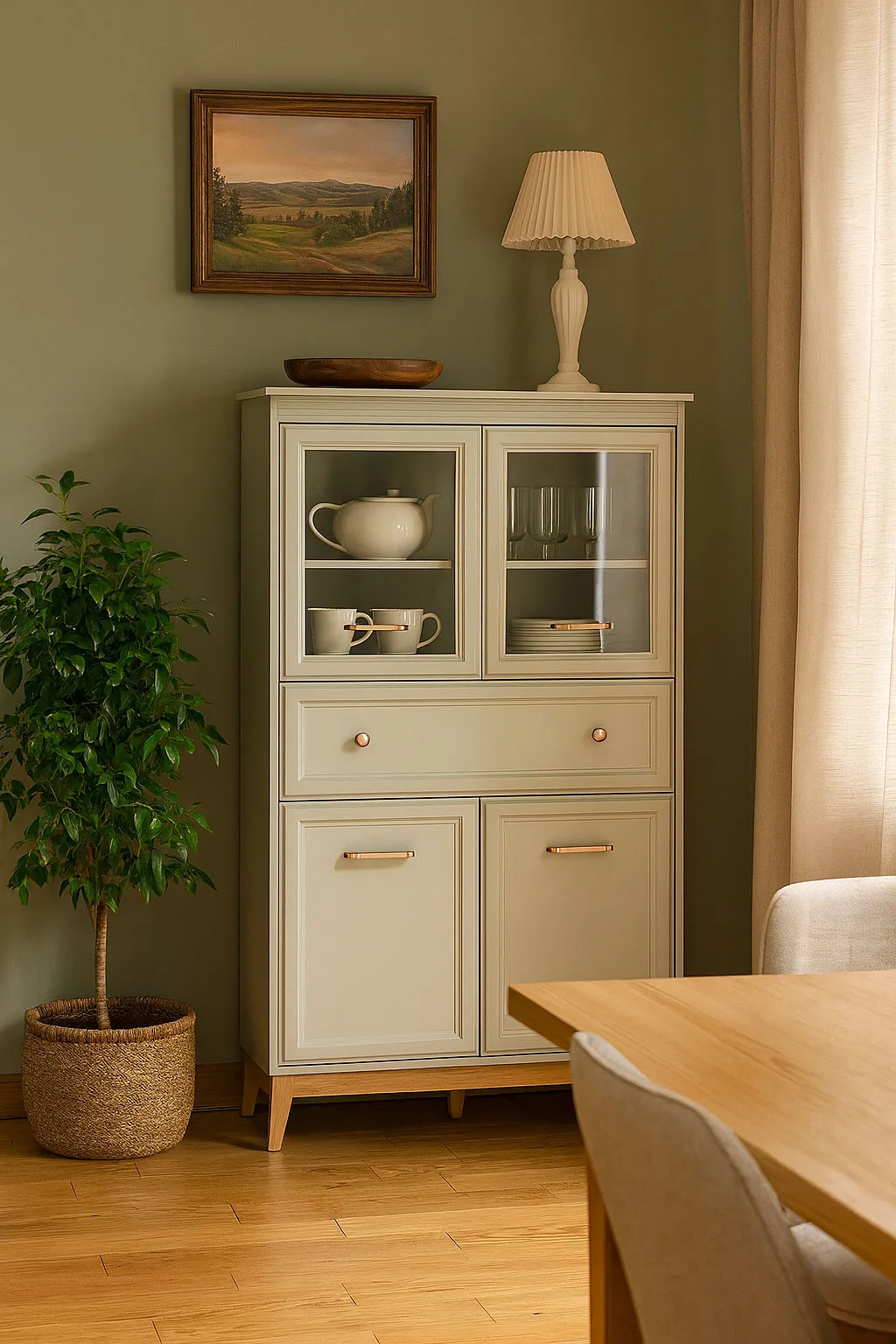 Witryna w skandynawskim stylu, która naprawdę robi wrażenie. Połączenie przeszklonej góry z ryflowanym dołem wygląda bardzo nowocześnie, a przy tym jest funkcjonalne. Kaszmirowy odcień nie jest zbyt chłodny i ładnie komponuje się z drewnianą podłogą.