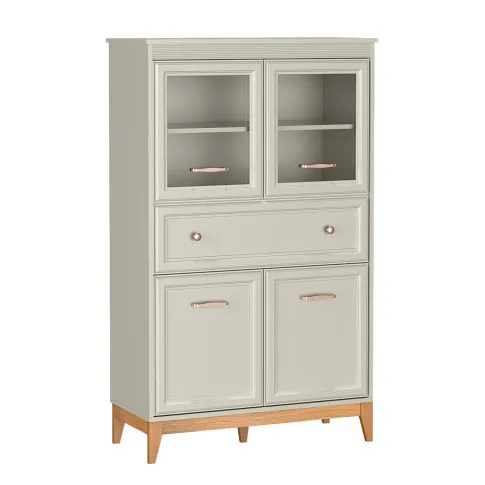 Witryna Lunvior 7X marki Edinos Premium to elegancki i funkcjonalny mebel, który łączy stylową ekspozycję z praktycznym przechowywaniem. W górnej części znajdują się dwie przeszklone półki na dekoracje lub szkło, poniżej szeroka szuflada na drobiazgi, a na dole dwie zamykane szafki z półkami na naczynia lub tekstylia. Jej klasyczno-skandynawski design w odcieniu kaszmiru z drewnianymi akcentami sprawia, że doskonale pasuje do salonu, jadalni lub gabinetu, wprowadzając do wnętrza ciepło, porządek i subtelną elegancję.