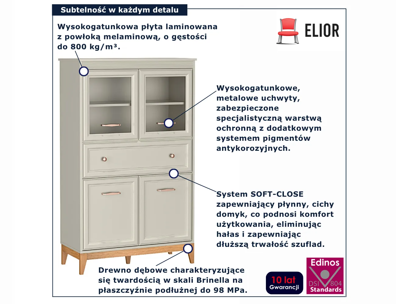 • Produkt posiada certyfikat jakości "Edinos Standards DSI 804", który potwierdza najwyższą jakość wykonania mebla oraz pełny stopień zgodności poszczególnych jednostek wytworzonego wyrobu z przyjętym wzorcem.